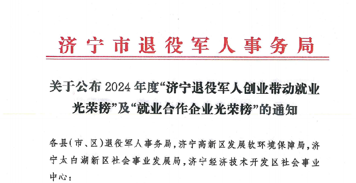 济宁市退役军人事务局公布2024年度“济宁退役军人创业带动就业光荣榜”及“就业合作企业光荣榜”,其中,山东BWIN必赢国际机械股份有限公司位列“济宁退役军人就业合作企业光荣榜”。
